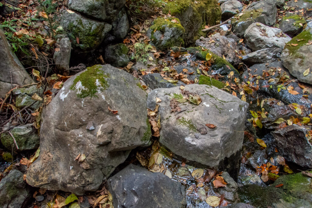 その後絶望的なガレ、荒れ荒れの荒れ状態の箇所を通過する中、やたらこの谷の岩には白いチョーク跡みたいなものがついていることに気づく。