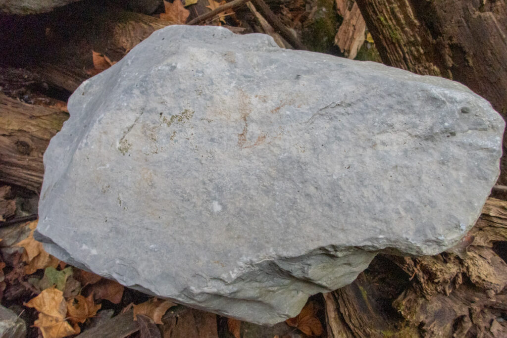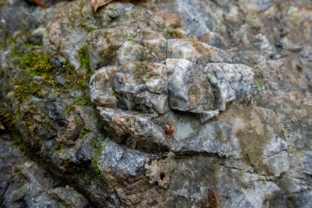 入川工場が採掘する主母岩は「硬砂岩」であるが、このエリアは中生代 ジュラ紀の混在岩で、様々な岩石が混在している。一部は風化した石灰岩がボロボロに川底に散らばり、無数の浮石になっているのだろう。