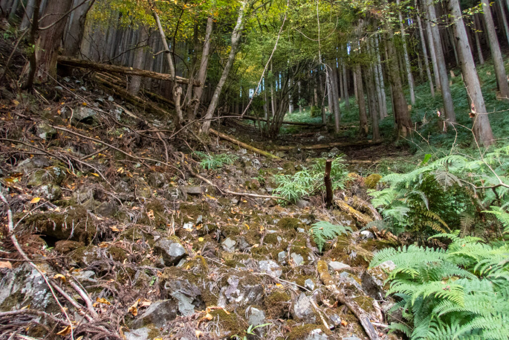この先686m地点にて、浮石にてさっきよりも下の右脛を強く打った。さらにワサビ田跡が現れ、718m地点でもわさび田を構成していた岩が崩れて転倒し、左脛を打った。