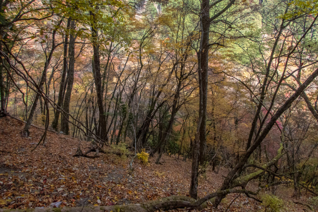 さっきまでいた尾根の南側の大蔵沢が岩だらけの詰めだったのに対し、この辺りは基本的に土斜面で全く地形の様相が違うことも面白い。紅葉もいい感じであることが視界に入ってきた。